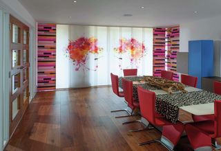 El reto para este proyecto residencial fue trabajar en estrecha colaboración con el cliente, quien tenía una idea muy clara de lo que quería conseguir. Fue necesario colocar imágenes enormes en grandes áreas de tela, prestando especial atención a las superposiciones de los paneles. La elección del tejido tuvo que ser considerada cuidadosamente para garantizar que las imágenes fueran de la más alta calidad y al mismo tiempo controlar la luz y el resplandor resultantes de grandes ventanales de cristal. El tejido Silent Gliss Multi Shadow fue seleccionado como el ideal para la impresión digital y el corte por láser debido a su fina estructura.
