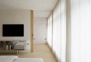 En colaboración con Bon Design, Silent Gliss suministró rieles y cortinas para hacer realidad esta visión. Las delicadas y discretas cortinas de confección suiza con los tejidos translúcidos Polyflax y Someo, colgadas en rieles SG 6465 y mediante las exclusivas correderas silenciosas patentadas de dos componentes, aportaron una sutil elegancia a un interior sobrio y de ensueño.