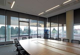 El edificio está equipado con sistemas enrollables motorizados y sistemas de rieles motorizados. El especialista encargado de diseñar la acústica de las salas seleccionó el tejido Jumbotex de Silent Gliss para mejorar el sonido en las oficinas diáfanas y la guardería interna. Los sistemas de cortinas enrollables de las oficinas utilizan tejido Lightscreen para garantizar la protección antideslumbramiento necesaria.