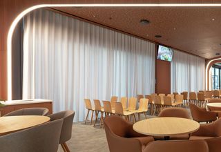 Over 250 curtains hang on Silent Gliss electric and hand-operated curtain tracks integrated into a KNX building automation system. This solution reduced glare and solar heat gain while significantly cutting embodied carbon through streamlined cabling and installation.