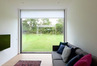 Le bâtiment de plain-pied est agrémenté de grandes baies vitrées. Fidèles à ses lignes épurées et à son design minimaliste, les enrouleurs SG 4970 sont discrètement installés dans une niche. Réalisés en tissu blanc Colorama 2, les stores diffusent délicatement la lumière dans cet espace intérieur remarquable et chaleureux.